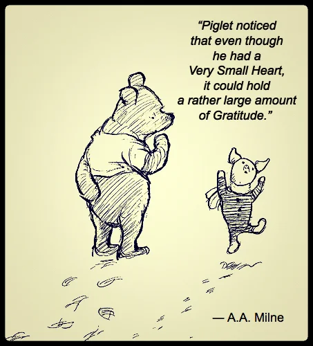 Some days are tougher than others. My paternal grandmother passed away yesterday. There is a lot to do, my parents are overwhelmed, and we are beginning our grief process. We all share these life events, and each of us will handle it and perceive it differently. How to find gratitude when there is grief? For me, reading the words from A.A. Milne warms my heart. Piglet is correct, even the smallest space can contain a great deal of gratitude. I am grateful for the time I spent with my parents today, grateful that my employer provided flexibility with my schedule, and grateful for the mortuary staff who were so gracious and helpful.